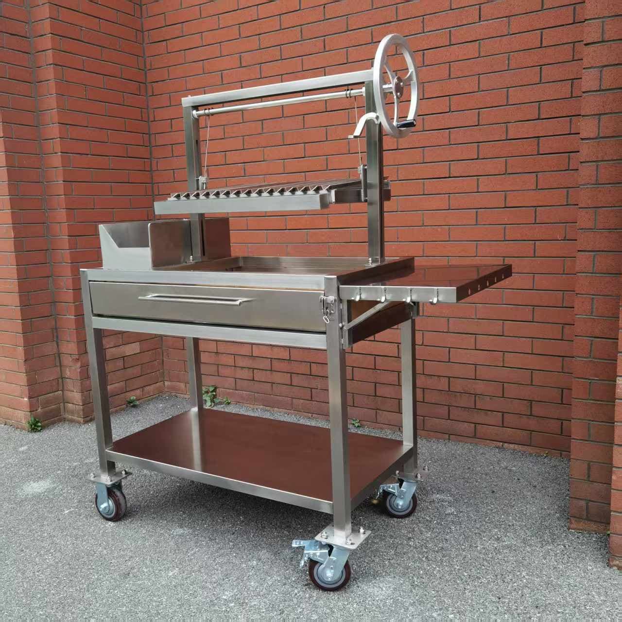 A central wood chamber releases coals through its base to feed the heat bed beneath the grill. This design captures the essence of Argentine asado — cooking with glowing embers for deep, smoky flavour.