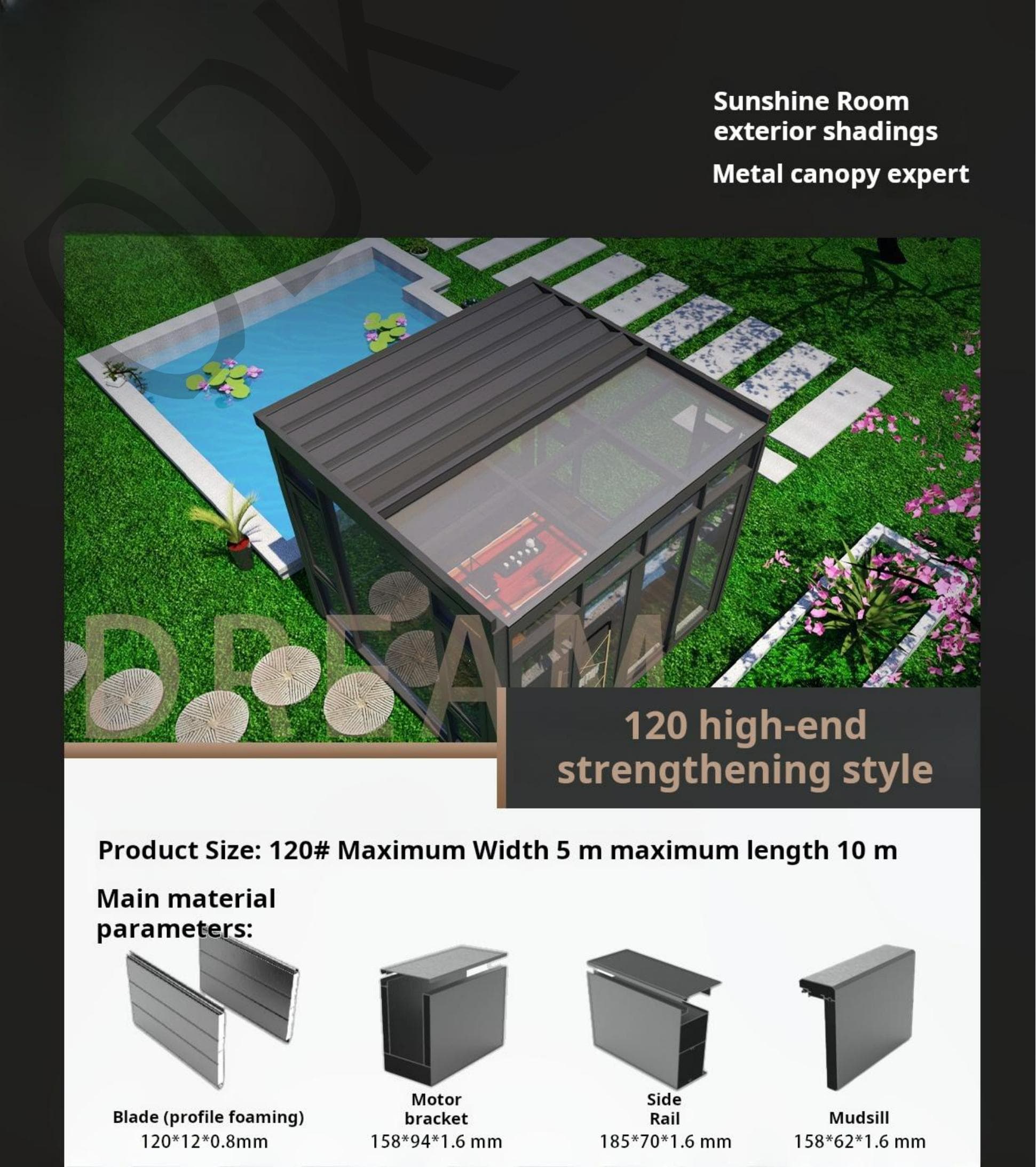 The M120 Folding Waterproof Metal Film is a next-generation sunshade solution designed to combine sleek aesthetics with advanced weather protection. Unlike traditional metal sunshades, the M120 is engineered with a fully integrated drainage system and sink, delivering complete waterproof performance — even during heavy rain.