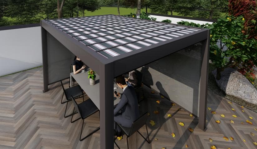 Enjoy the aesthetic of a louvre pergola with retractable fabric panels for flexible sun and rain protection. This hybrid design delivers the best of both worlds – style and adaptability.