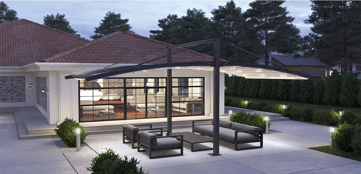 Equipped with Somfy® wind and sun sensors, the Falcate Tectona adjusts automatically to changing conditions.