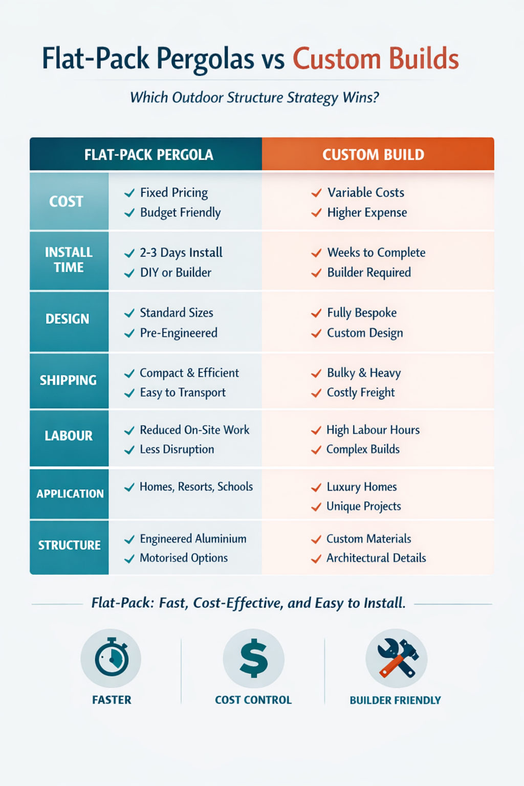 Flat-pack pergolas are designed for faster assembly and are often installed by builders within a compressed timeframe.