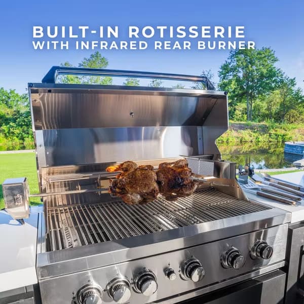 Premium 5-Burner Gas Grill – Equipped with infrared rear burner and built-in rotisserie for roasting perfection.