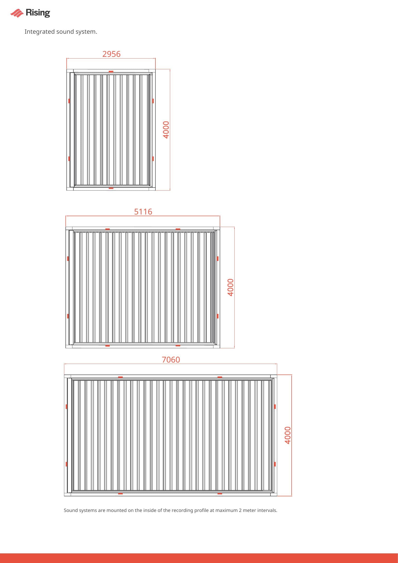 Technical Layout: System drawings reference modular bay spans of approximately 2956 mm, 5116 mm, and 7060 mm, helping planners and installers maintain uniform spacing across larger builds.