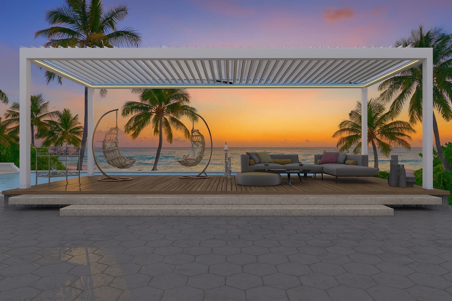 These innovative blades allow light to pass through even when the roof is closed, creating a bright and welcoming atmosphere while maintaining full waterproof functionality.