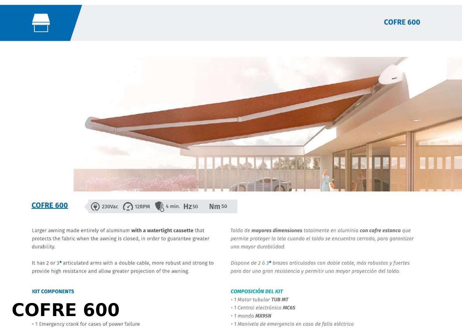 The Lusitania Cofre 600 is designed for larger outdoor areas, offering greater coverage with its watertight aluminum cassette. It comes with 2 or 3 articulated arms, reinforced with double cables for higher strength and wind resistance.