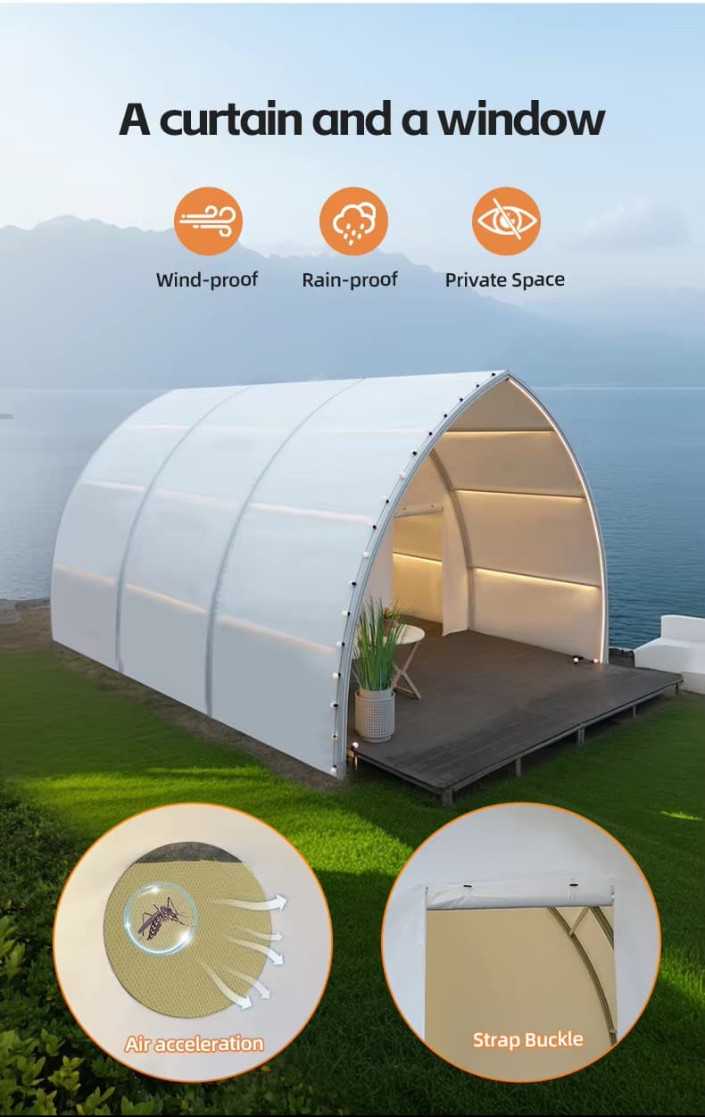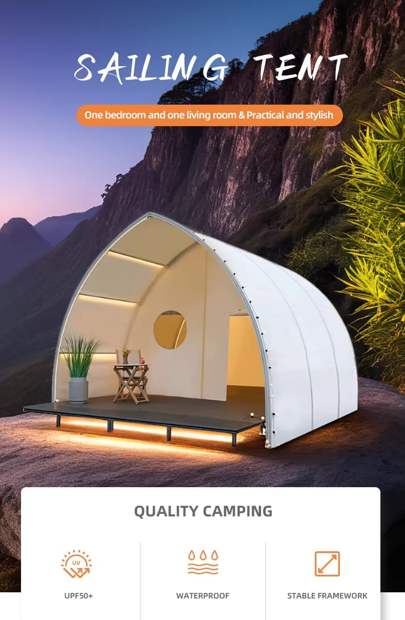 Designed for high-end resorts, eco-retreats, and glamping experiences, the Nautis Glamping Tent combines the architectural elegance of a yacht sail with all-season resilience. Built with a precision-engineered aluminium alloy frame and 650 g/㎡ PVC fabric, this tent provides durable, year-round shelter with an unmistakable modern aesthetic — perfectly suited to New Zealand and Pacific Island climates.