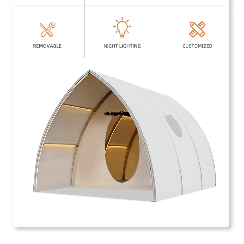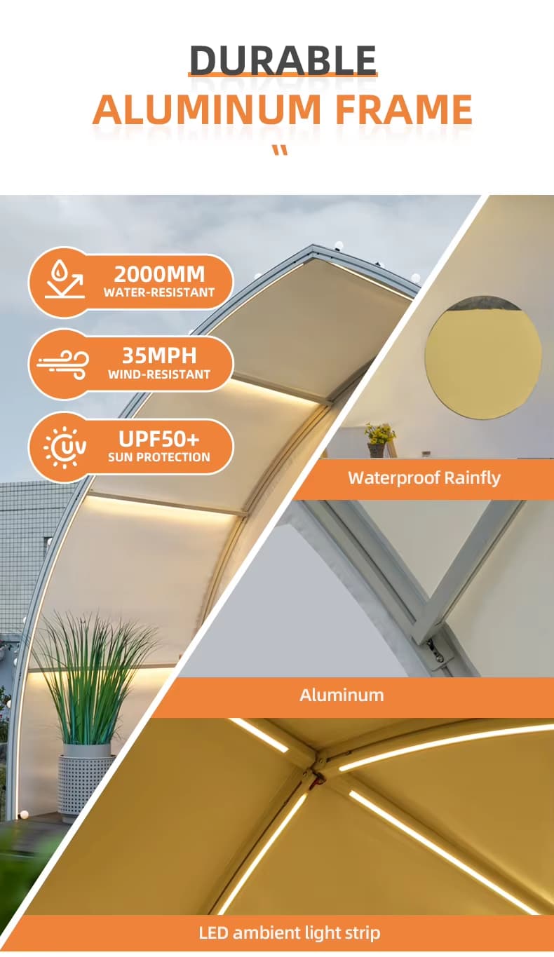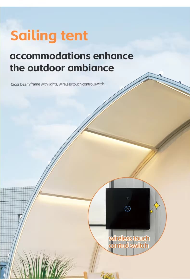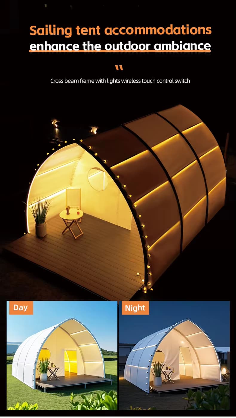 The Nautis includes integrated LED ambient light strips with wireless touch control, adding warm illumination that transitions effortlessly from day to night — ideal for luxury resorts, eco-retreats, and private villas.