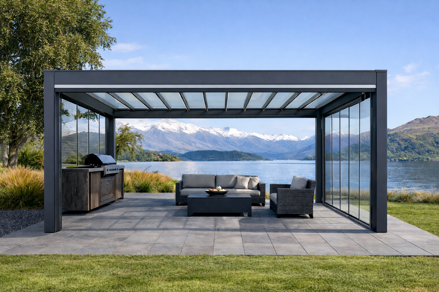 The Orion Sky is a modern fixed polycarbonate roof system built on the renowned Orion aluminium frame by Apollo NZ. Designed within the wider Orion System family, Orion Sky delivers the structural strength and architectural finish of the Orion Prime and Orion Core — while replacing the operable louvre roof with a fixed translucent roof that maximises natural light and weather protection.