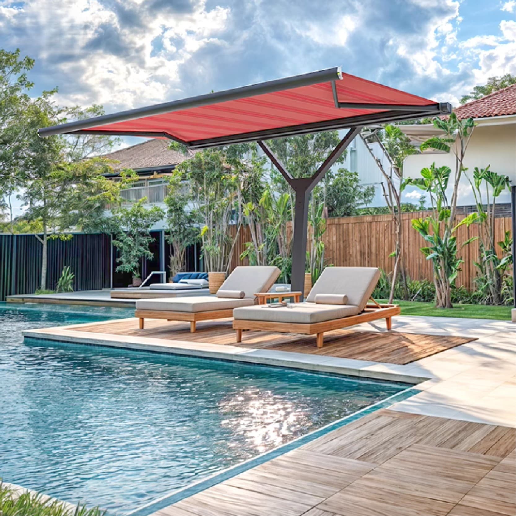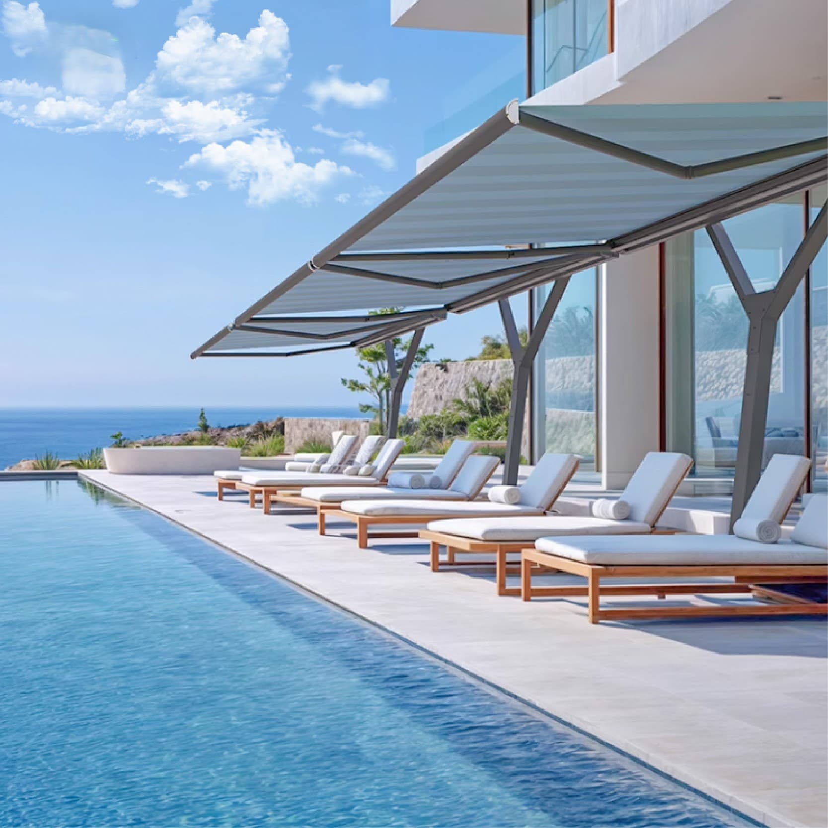 The PillarShade System redefines outdoor shading with its sleek, freestanding post design and high-performance European fabric. Designed for style, strength, and flexibility, this system is ideal for poolsides, patios, cafés, and open-air lounges where traditional wall-mounted awnings are not an option.