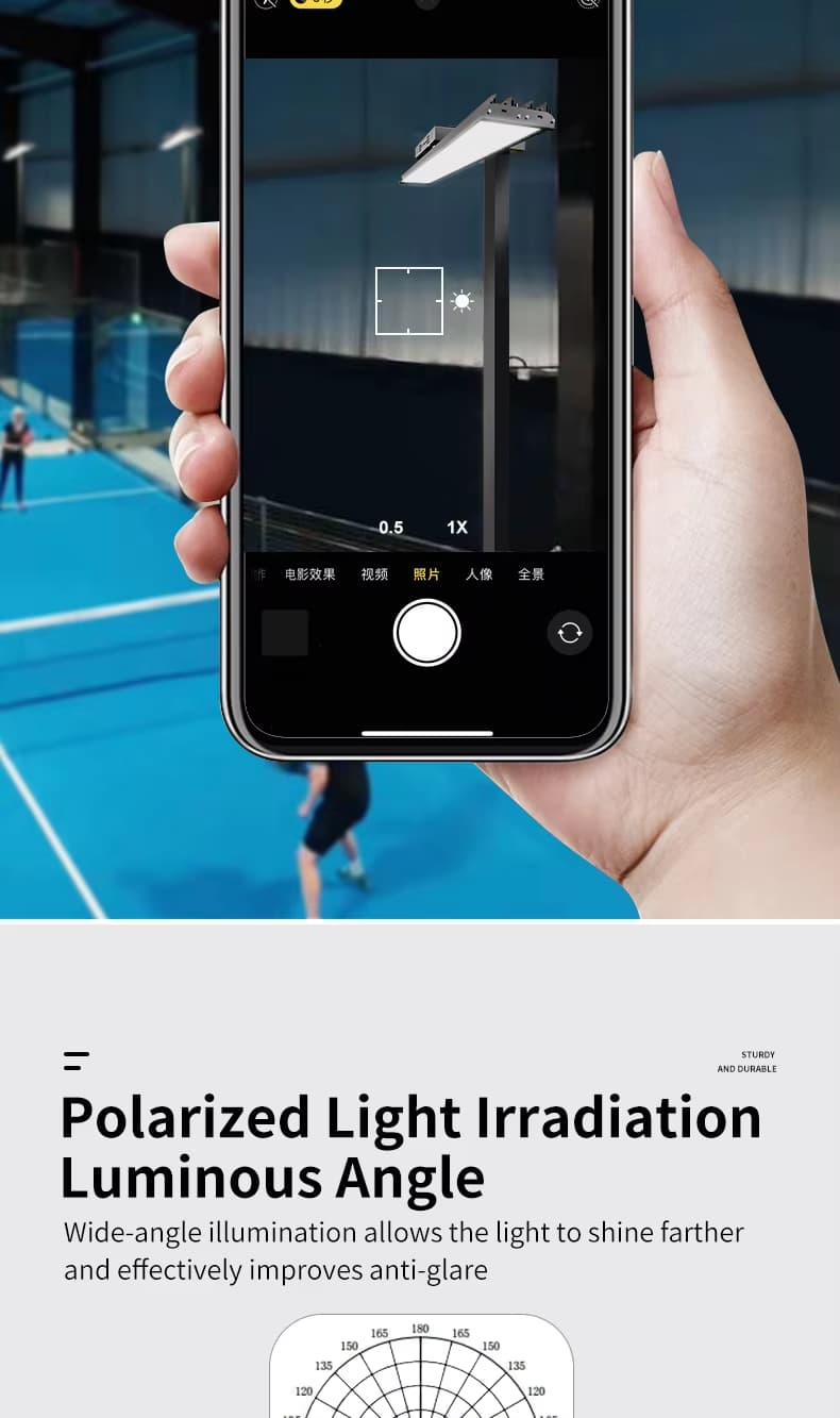 The anti-glare optical design ensures clear visibility without harsh light spill, improving player comfort while maintaining professional lighting standards.