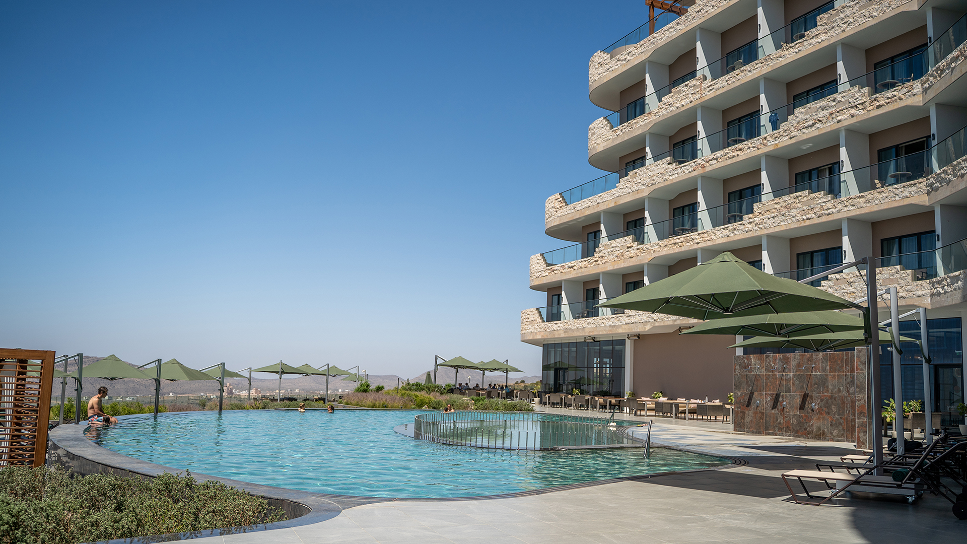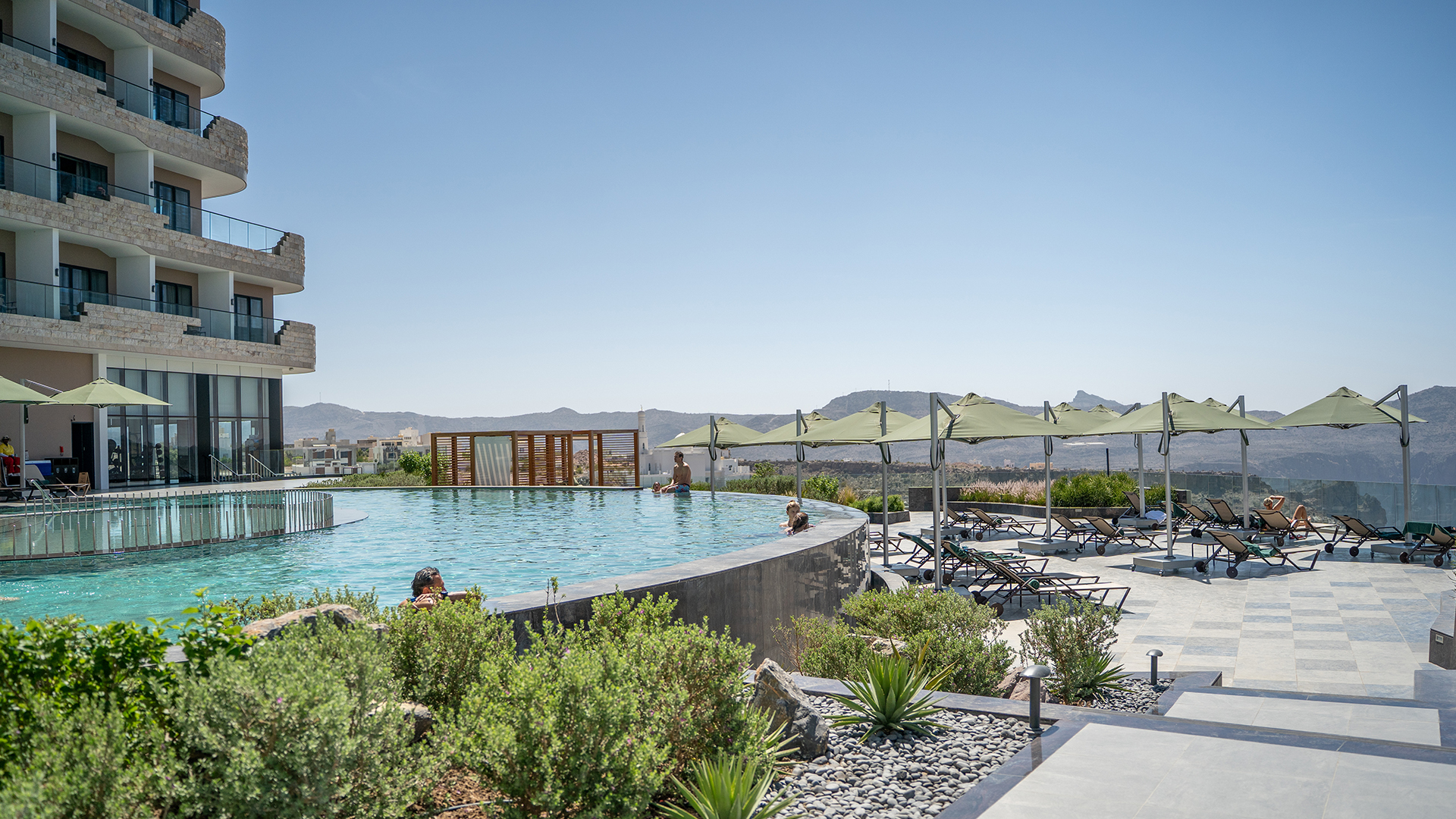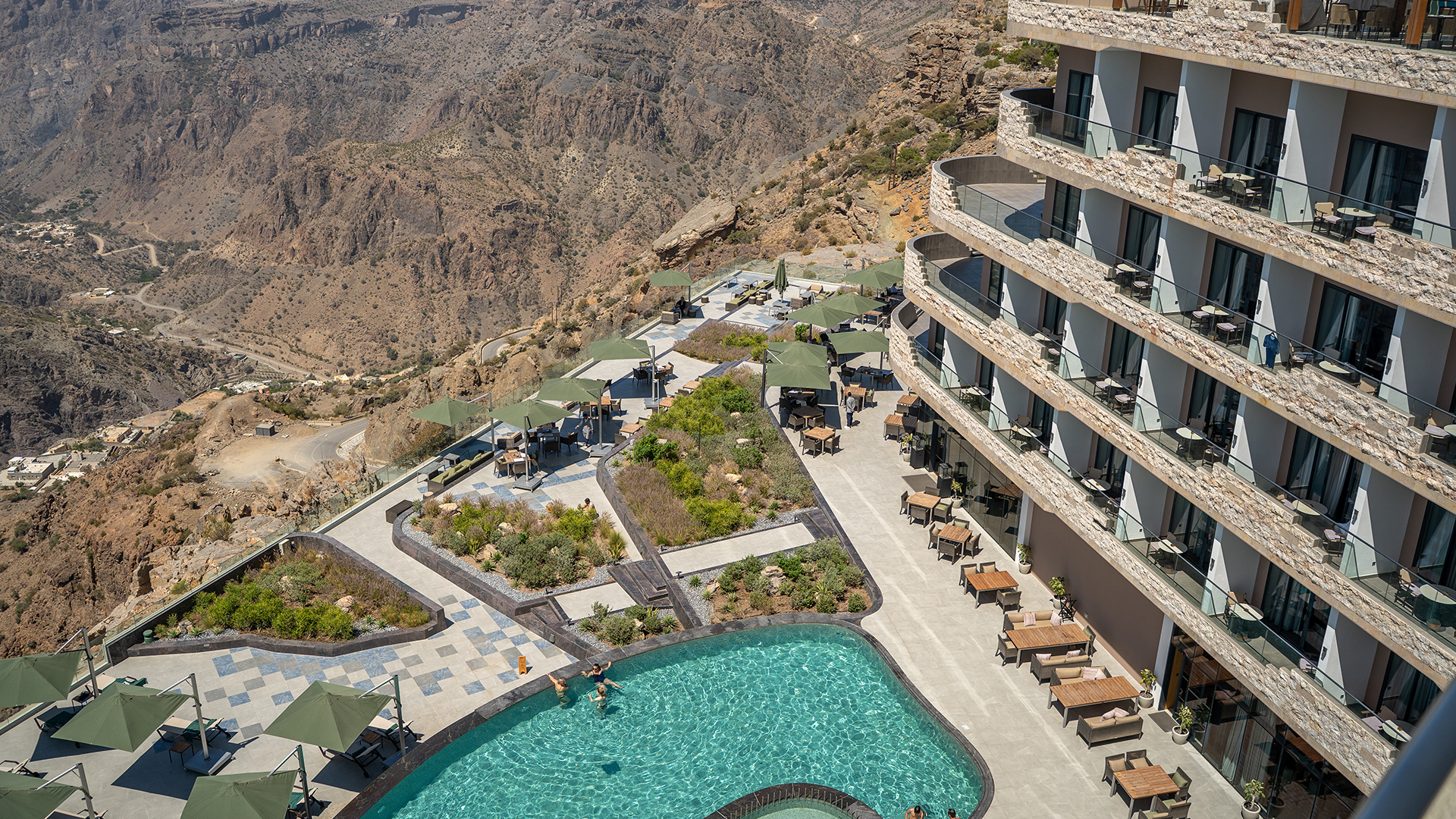 High above the foothills of the Al Hajar Mountains, Hotel Indigo Jabal Akhdar Resort & Spa overlooks rugged plateaus, deep canyons, and sweeping desert valleys. The resort’s cliff-edge dining areas, luxury terraces, and panoramic lounges required a shade system that not only enhanced guest comfort but also harmonised with the natural stone architecture and mountain landscape.