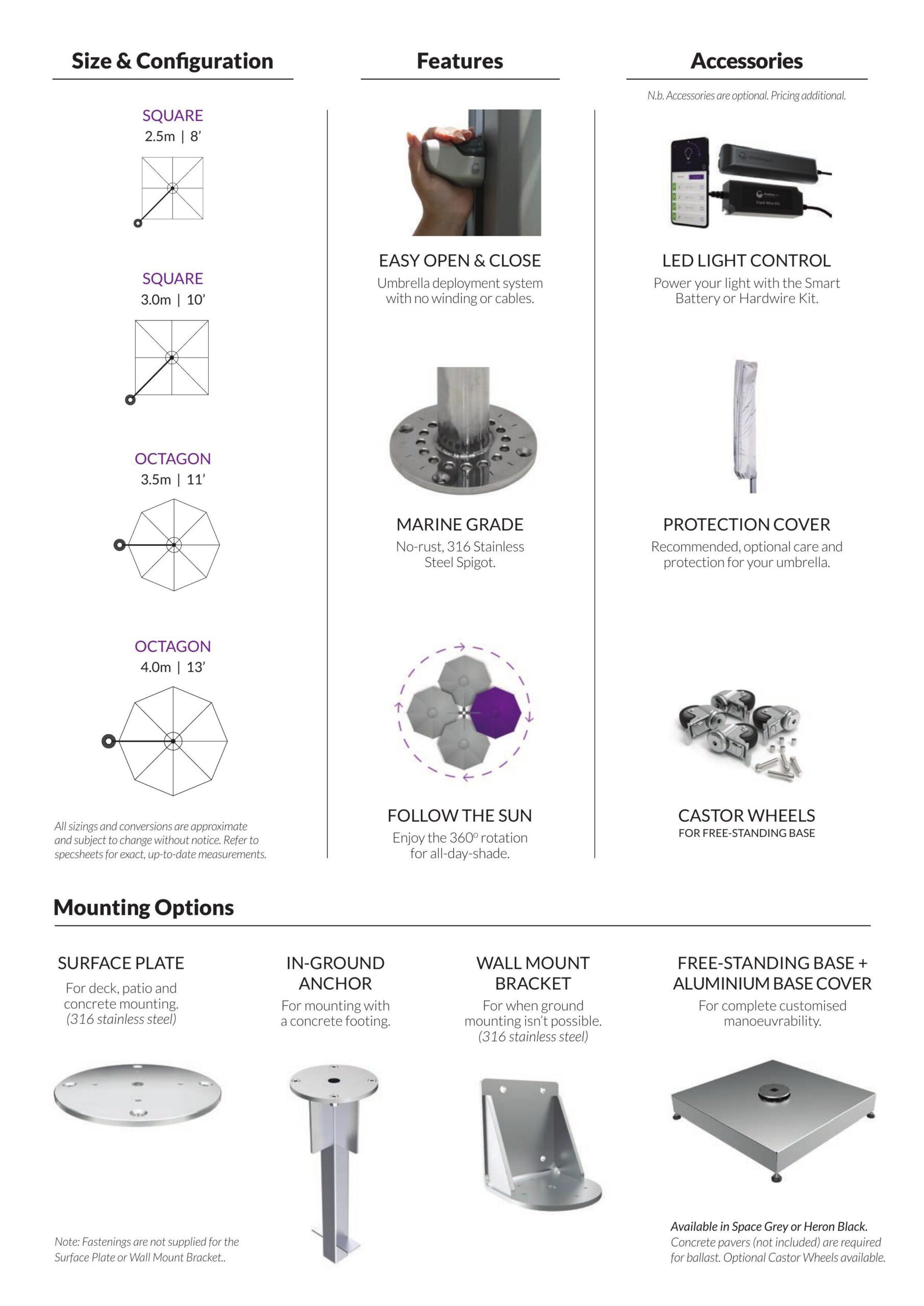 Bring architectural shade and effortless comfort to your outdoor living with the Shadowspec Serenity™ Single Canopy Rotating Cantilever Umbrella. Hand-built in New Zealand, this marine-grade umbrella blends precision engineering with elegant design, creating ambience and protection that lasts.