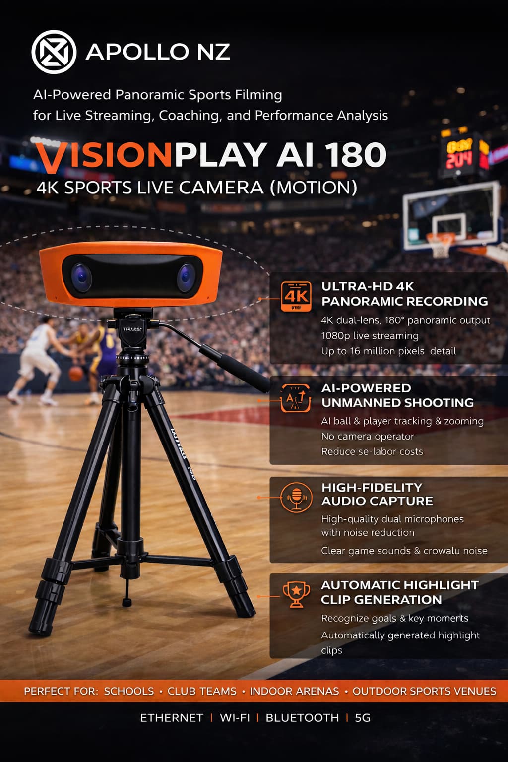 VisionPlay AI 180 – 4K Sports Live Camera (Motion) brings intelligent, automated sports filming into one compact and cost-effective system β€” designed for modern sports coverage, live streaming, and performance analysis.